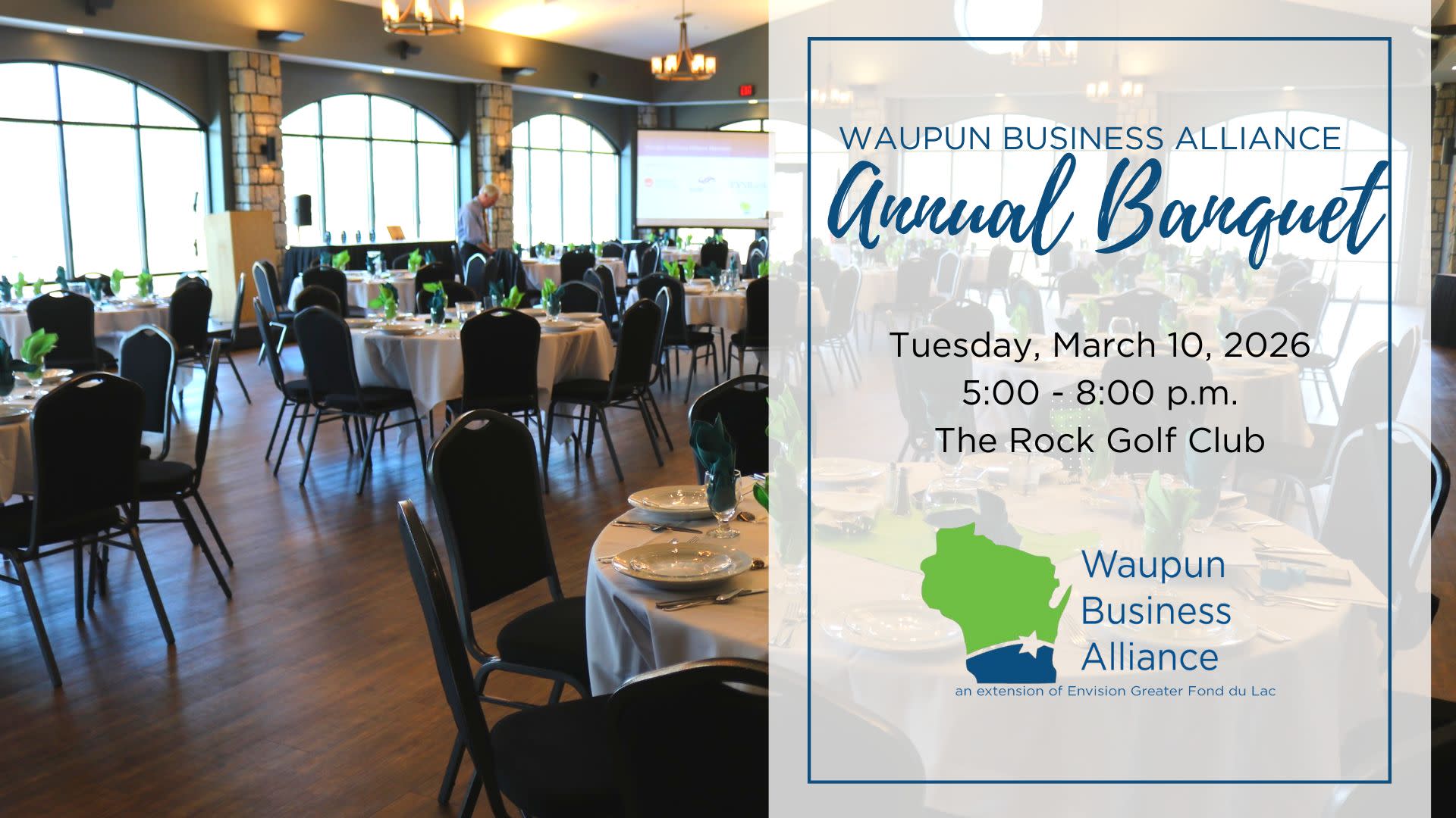 Event timeline:5:00 Cocktail and Networking Hour6:00 Dinner6:30 Updates from City of Waupun and Envision Greater Fond du Lac7:15 Awards Celebration8:00 Conclusion