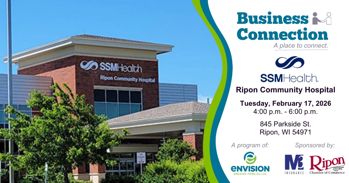 SSM Health Ripon Community Hospital is excited to host our February Business Connection, and you are invited to join us for an evening of networking, collaboration, and community building. From 4:00 p.m. to 6:00 p.m., connect with local business leaders, meet new professionals, and strengthen relationships that support growth across Fond du Lac County.