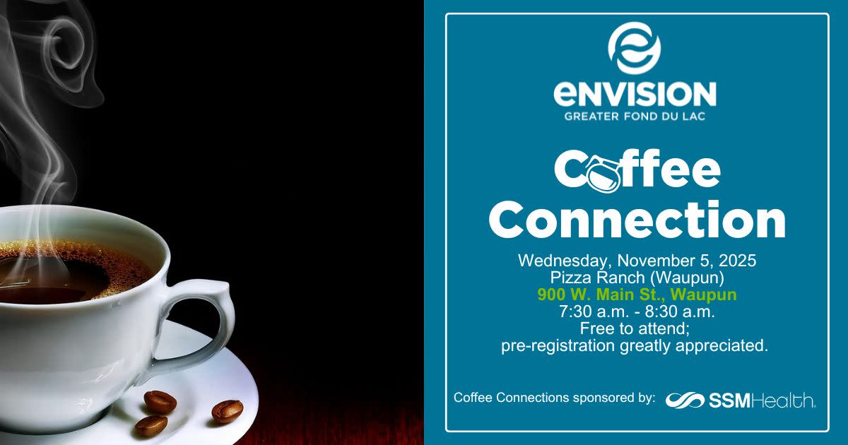 These are not just about coffee; the coffee has little to do with this actually. It’s an opportunity for professionals looking to network and pick each other’s brains (as they get caffeinated) to build relationships and exchange ideas in a comfortable, laid-back atmosphere. Coffee Connections are a great way to get a ‘flavor’ of the business community in a nicely “blended” environment. It will be a latte of fun…no roasting allowed. Each participant will get a one-minute commercial to introduce themselves, their business, and any topics they’d enjoy having conversations about. Participants are encouraged to bring their business cards and handouts. Coffee Connections are open to all members of Envision Greater Fond du Lac. If you are interested in attending as a guest, please contact Mike at mrhode@envisiongreaterfdl.com. Is there anything we can do to make this event as accessible and enjoyable as possible for you? We want to ensure everyone feels comfortable and has a great experience, so please let us know if there are specific accommodations or assistance that would enhance your enjoyment by contacting us at: info@envisiongreaterfdl.com
