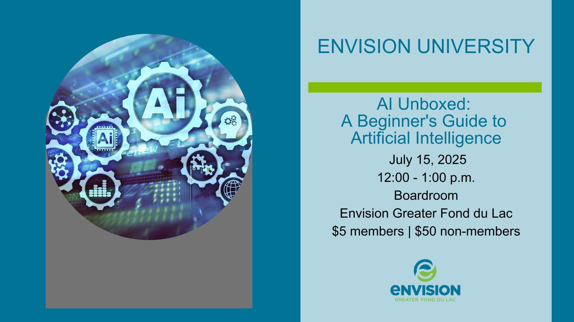 Curious about artificial intelligence but not sure where to start? In this engaging one-hour workshop, you'll learn the fundamentals of AI, explore its everyday applications, and demystify common misconceptions. Perfect for beginners, this session will break down concepts into easy-to-understand ideas, empowering you to grasp how AI is shaping the world and how you can use it in your personal or professional life. Whether you're a tech enthusiast or just AI-curious, this workshop is your first step into the future! Presented by Tracy Qualmann, Envision Greater Fond du Lac No refunds will be given on purchased admission to this event. Is there anything we can do to make this event as accessible and enjoyable as possible for you? We want to ensure everyone feels comfortable and has a great experience, so please let us know if there are specific accommodations or assistance that would enhance your enjoyment by contacting us at: info@envisiongreaterfdl.com Cost: No refunds will be given on purchased admission to this event.