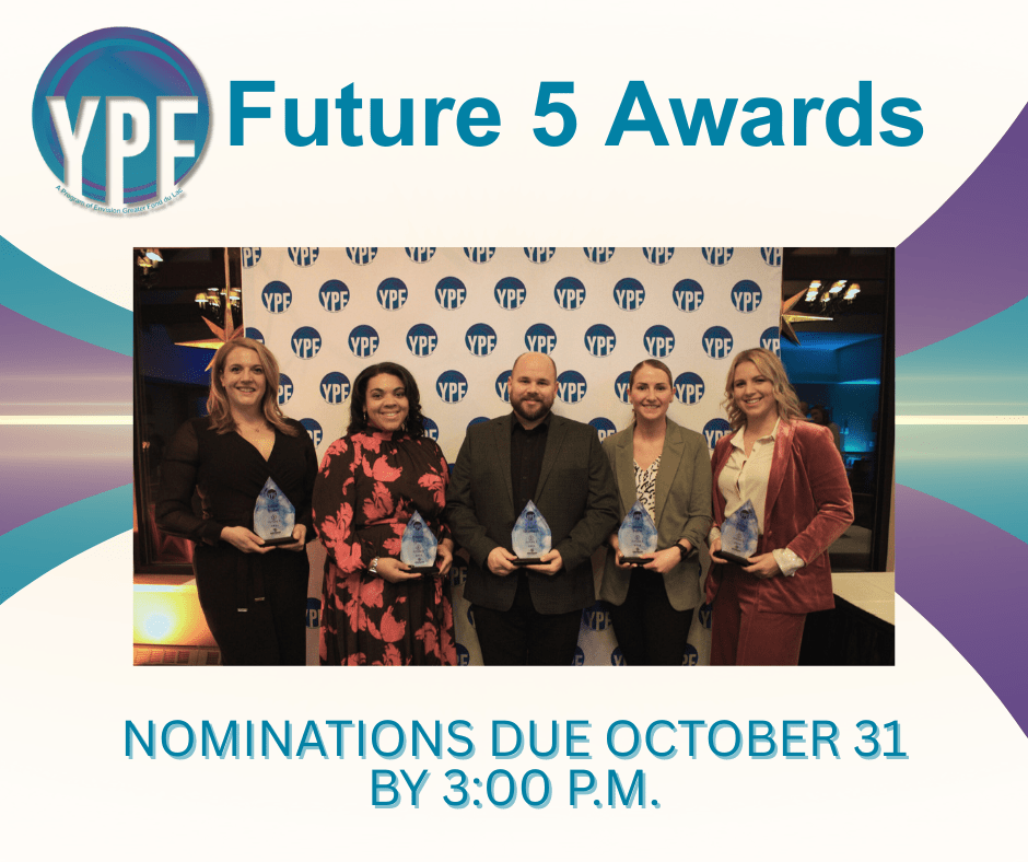 The Young Professionals of Fond du Lac (YPF) established the Future 5 Award in 2013 as a way to support and recognize upcoming leaders in the community. This award is presented to five area young professionals ages 21-40 who are presently growing and excelling in their respective fields and will continue to positively influence the growth, prosperity, and quality of life in Fond du Lac County well into the future. Eligible candidates must be nominated by a professional or volunteer reference (i.e. an individual with whom they have worked and/or volunteered/served with). The nomination process includes submitting a completed nomination form to Envision Greater Fond du Lac by October 31. Nomination Window : October 1 - October 31 (https://www.envisiongreaterfdl.com/ypf/ypf-future-5/) Is there anything we can do to make this event as accessible and enjoyable as possible for you? We want to ensure everyone feels comfortable and has a great experience, so please let us know if there are specific accommodations or assistance that would enhance your enjoyment by contacting us at: info@envisiongreaterfdl.com Cost: No refunds will be given on purchased admission to this event.