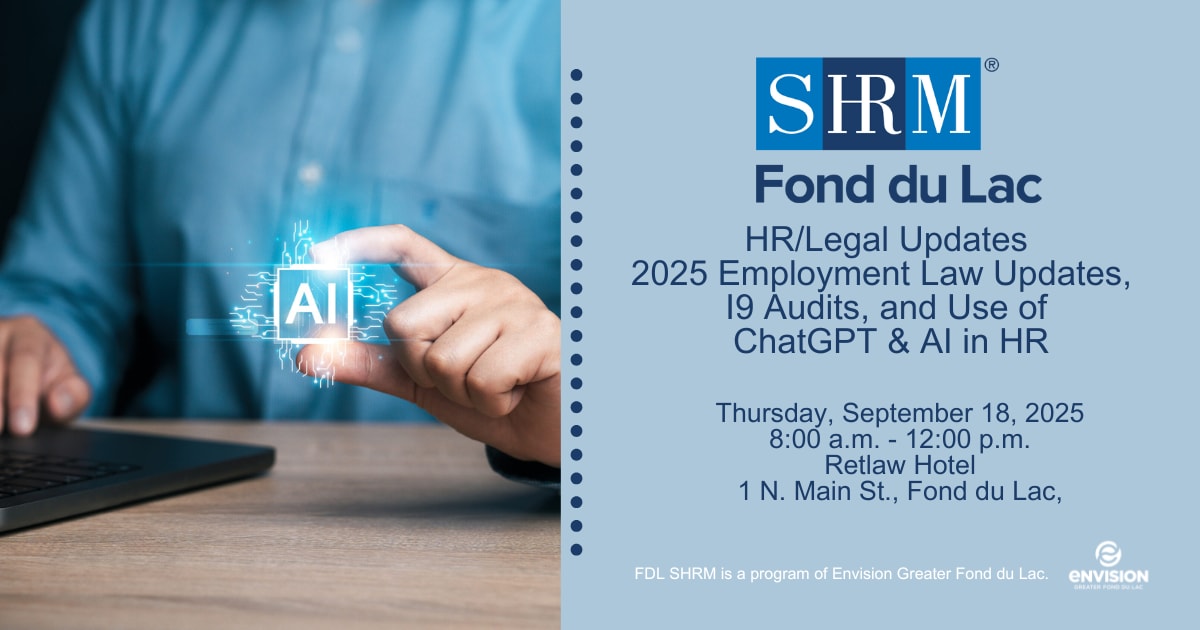 Employment Law Updates (Erica Storm, Bill Fischer) The Trump administration has brought radical shifts in the legal landscape, with employment law being no exception. The presentation will provide a rapid-fire overview of the changes that promise to most impact the work of Human Resources professionals, and suggestions as to how to prepare for the uncertainties that still lie ahead. The presentation will also touch on changes in Wisconsin law over the past year, including legislative and administrative actions, and impactful court decisions. I9 Audits (Patrick Leigl, Bill Fischer) Every employer is legally required to complete a Form I9 for all new employees, to verify the employee’s identity and employment authorization. An I9 Audit is a process conducted by Immigration and Customs Enforcement and Homeland Security Investigations to ensure employers are following legal hiring practices. With the Trump administration’s focus on immigration policy, the I9 Audit has come into the spotlight. This program will take you through the process, from filling out and filing the Form I9, to how to respond to the Notice of Inspection, through the investigation and conclusion. The program will also touch on best practices for employers, including ways to approach internal I9 audits. Use of ChatGPT and AI in Human Resources (Bill Fischer) Used carefully, Artificial Intelligence platforms such as ChatGPT can enhance the role of Human Resource personnel, by increasing efficiency, reducing manual workload, and assisting with compliance management. However, with the benefits comes significant challenges, such as data privacy and security concerns, hidden biases, lack of transparency, ethical considerations and loss of the “human touch.” This presentation will provide an overview of how AI is being used in the HR world, and discuss some of the legal and ethical quandaries that go with it. Agenda: 8:00 – 8:15 a.m. – Welcome and light breakfast served 8:15 – 9:15 a.m. – Employment Law Updates 9:30 – 10:30 a.m. – I9 Audits 10:45 – 11:45 a.m. – Use of ChatGPT and AI in HR Noon – dismissal Is there anything we can do to make this event as accessible and enjoyable as possible for you? We want to ensure everyone feels comfortable and has a great experience, so please let us know if there are specific accommodations or assistance that would enhance your enjoyment by contacting us at: info@envisiongreaterfdl.com Pricing for the event is FDL SHRM members – Free No refunds will be given on purchased admission to this event.