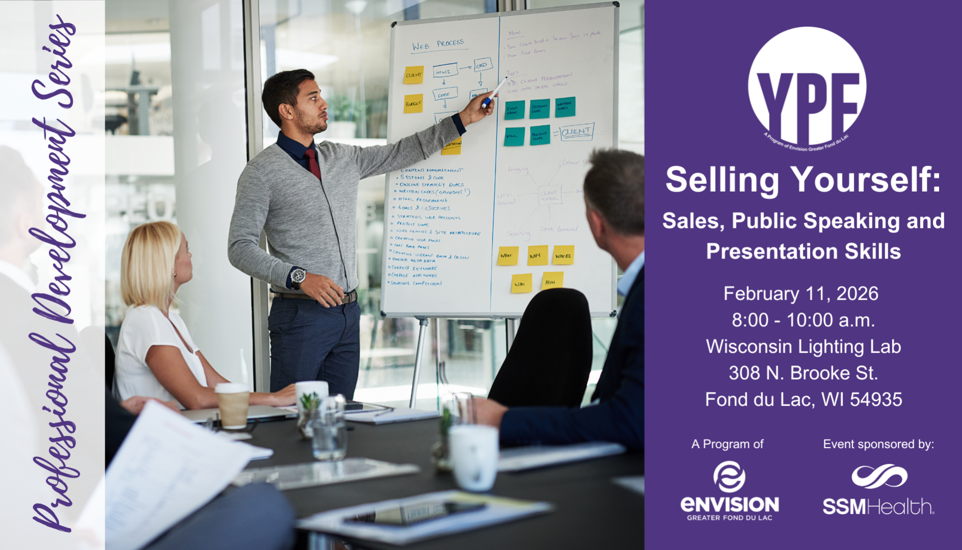 Join fellow young professionals in discovering how to sell your strengths with confidence, turning everyday interactions into opportunities that accelerate your careers. You’ll learn techniques to speak with authority, present with impact, and persuade your audience. This session is designed to grow your skillset of selling, public speaking and presenting. This PDS will be led by Heather Veeser, who is the Sales Program Manager in the Marketing Department at the University of Wisconsin–Oshkosh. She brings a wealth of expertise in marketing and sales, having previously served as a Senior Marketing Consultant at Exhibit Resource Skyline. Most recently, Heather expanded her professional experience through various networking groups including the Fox West Chamber of Commerce, where she worked closely with community engagement and brand development. Her diverse background reflects a strong commitment to driving growth, fostering connections, delivering impactful marketing strategies, and effective communication. The event runs from 8:00-10:00 a.m. and is hosted by the Young Professional of Fond du Lac, a program of Envision Greater Fond du Lac. Is there anything we can do to make this event as accessible and enjoyable as possible for you? We want to ensure everyone feels comfortable and has a great experience, so please let us know if there are specific accommodations or assistance that would enhance your enjoyment by contacting us at: info@envisiongreaterfdl.com