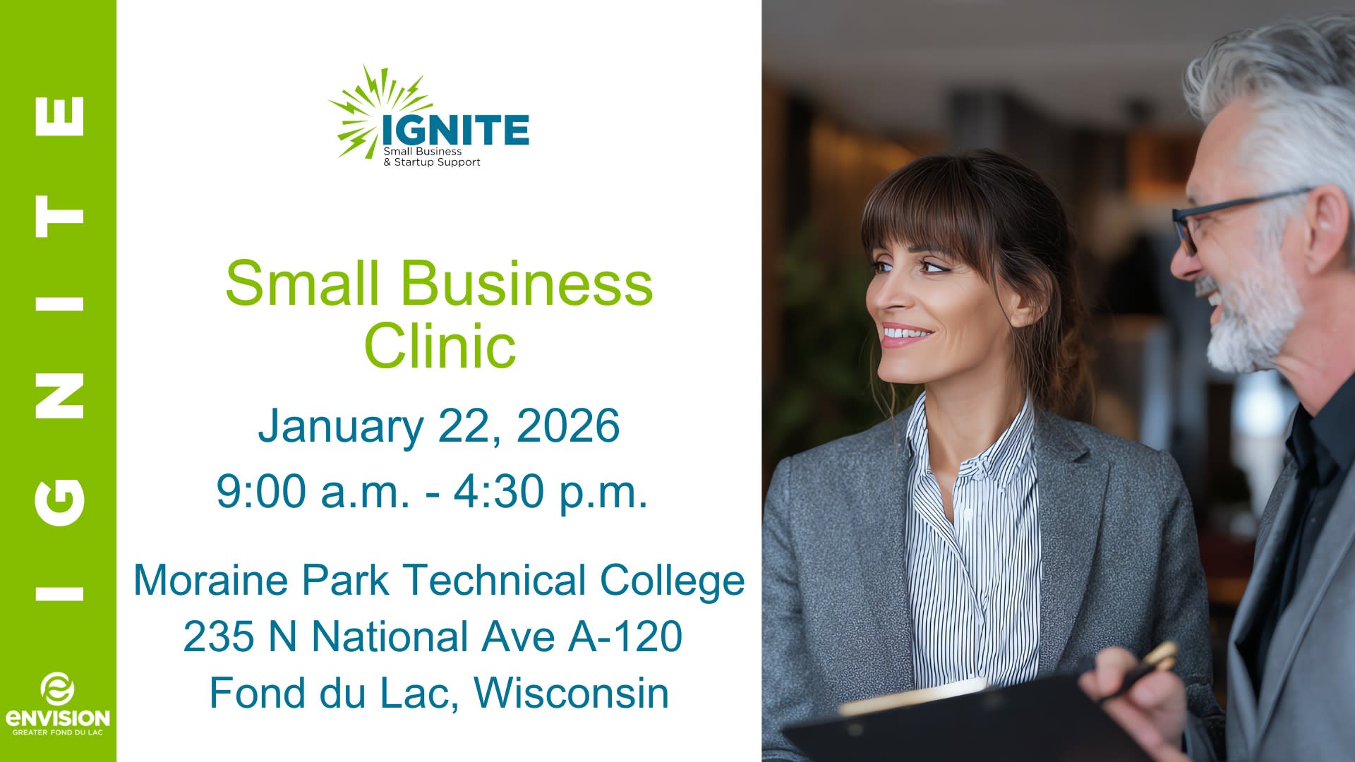 Presented by the Universities of Wisconsin's Office of Business and Entrepreneurship (OBE), Wisconsin SBDC Network, and Envision Greater Fond du Lac. Small Business Clinics are structured as one-stop shop events, in which you can “choose your own adventure” by participating in as many or as few sessions as you would like. The day can be customized by registering for sessions based on your needs and interests. Drop in-and-out as it fits best with your schedule! There is no cost to participate. Breakfast, lunch, and light refreshments will be served to attendees. What to expect: Is there anything we can do to make this event as accessible and enjoyable as possible for you? We want to ensure everyone feels comfortable and has a great experience, so please let us know if there are specific accommodations or assistance that would enhance your enjoyment by contacting us at: info@envisiongreaterfdl.com