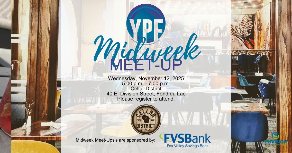 Join your fellow Young Professionals for networking and socializing at the Cellar District in Fond du Lac on Wednesday, November 12! The Midweek Meet-Up tis your chance to catch up with old friends or make new ones so you can continue to build meaningful personal and professional relationships that can be difficult to forge at larger events. Current YPF members and anyone curious about YPF is welcome to join in for this free drop-in event. Stop in anytime from 5:00 - 7:00 p.m. at the Cellar District. Registration is encouraged, but not required for this event so drop in even if you didn't have time to sign up! This event is hosted by Young Professional of Fond du Lac, a program of Envision Greater Fond du Lac. Is there anything we can do to make this event as accessible and enjoyable as possible for you? We want to ensure everyone feels comfortable and has a great experience, so please let us know if there are specific accommodations or assistance that would enhance your enjoyment by contacting us at: info@envisiongreaterfdl.com