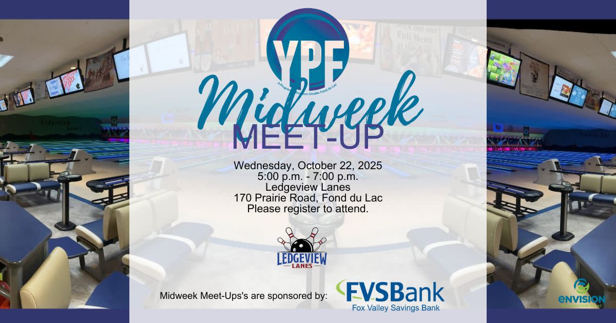 Join your fellow Young Professionals for networking and socializing at Ledgeview Lanes in Fond du Lac on Wednesday, October 22! The Midweek Meet-Up is your chance to catch up with old friends or make new ones so you can continue to build meaningful, personal, and professional relationships that can be difficult to forge at larger events. Current YPF members and anyone curious about YPF is welcome to join in for this free drop-in event. Stop in anytime from 5:00-7:00pm at Ledgeview Lanes and look for the YPF signage. Registration is encouraged, but not required for this event so drop in even if you didn't have time to sign up! This event is hosted by Young Professional of Fond du Lac, a program of Envision Greater Fond du Lac. This event is hosted by Young Professional of Fond du Lac, a program of Envision Greater Fond du Lac. Is there anything we can do to make this event as accessible and enjoyable as possible for you? We want to ensure everyone feels comfortable and has a great experience, so please let us know if there are specific accommodations or assistance that would enhance your enjoyment by contacting us at: info@envisiongreaterfdl.com
